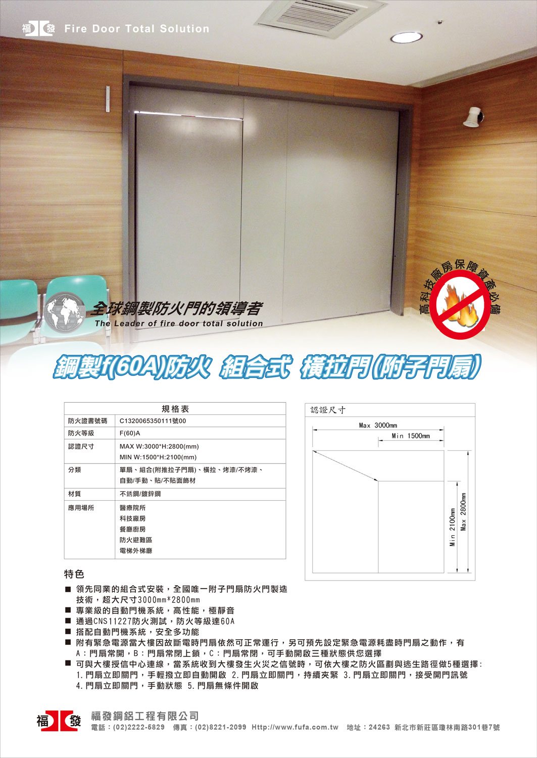 - 領先同業的組合式安裝,全國唯一附子門扇防火門製造技術,超大尺寸3000mm*2800mm