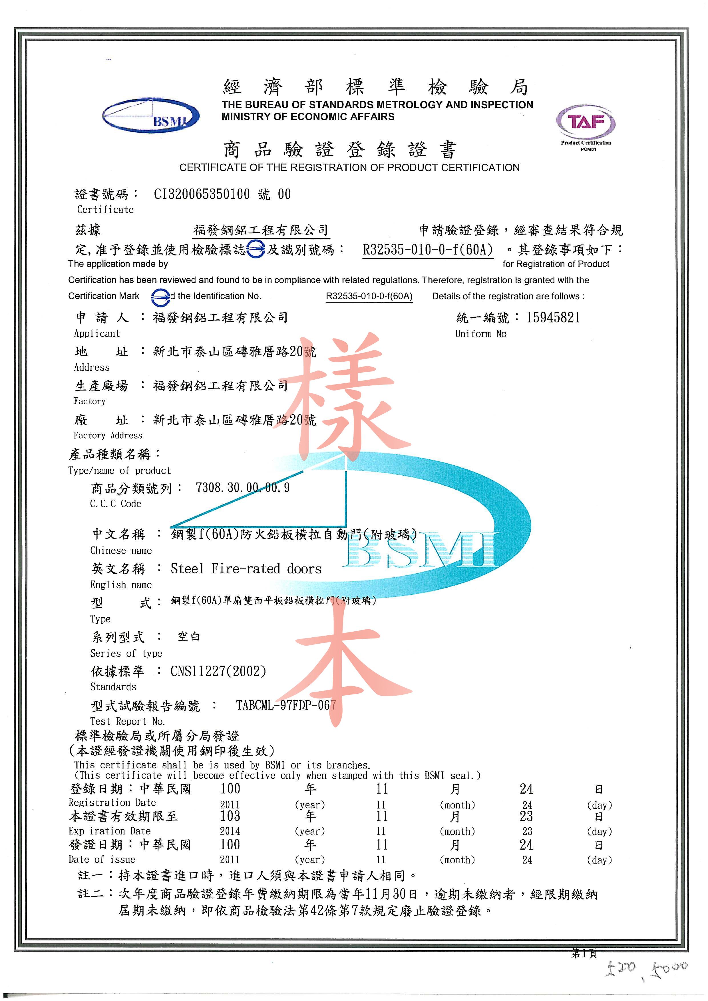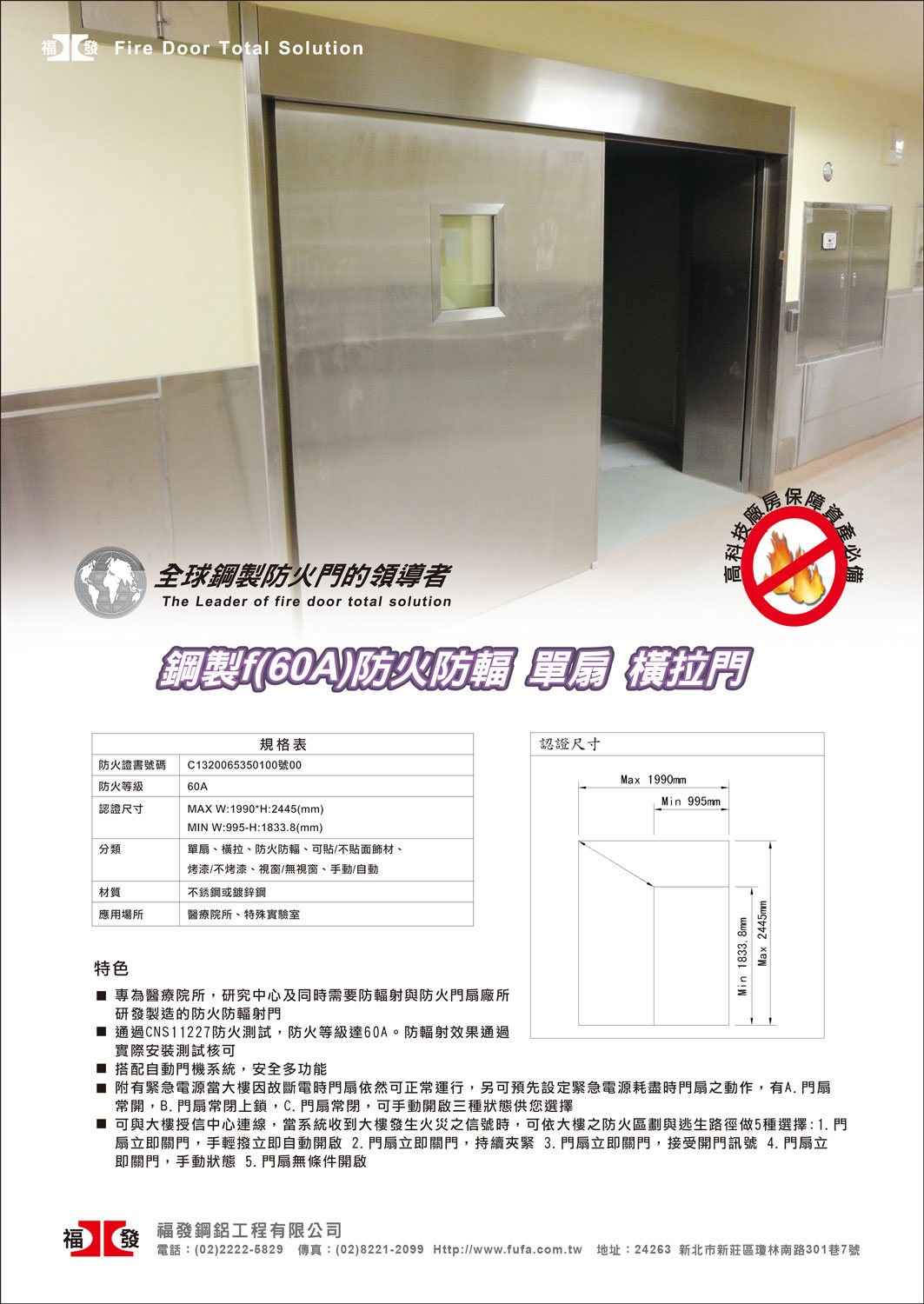 - 通過CNS 11227防火測試,防火等級達60A.防輻射效果通過實際安裝測試核可